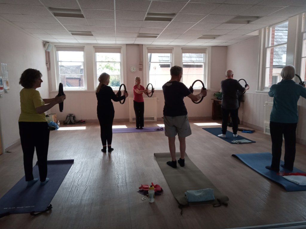Bring your own mat, we provide thera-bands, balls, circles, tubing. Promotion book £13 for new clients.