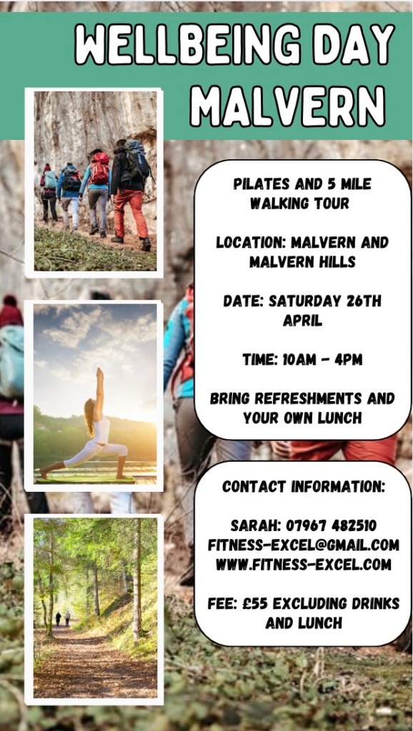 Relaxing leisurely walk on the Malvern Hills 4-5 miles, followed by a series of Pilates classes in the afternoon. Small group sessions – Book early as places are limited.